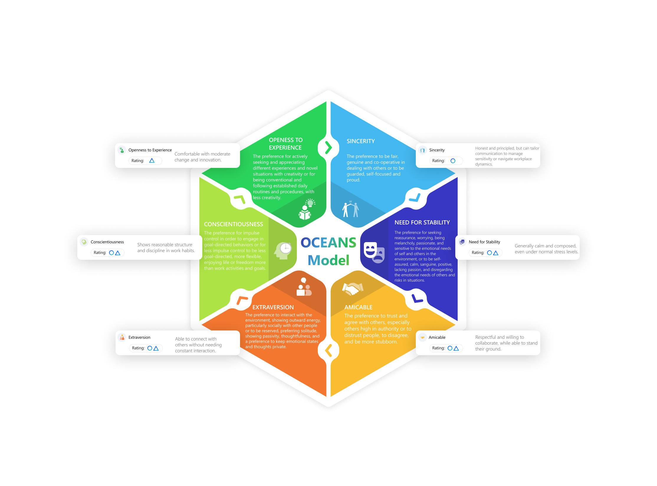 The OCEANS Personality Navigator is a scientifically-grounded psychometric tool designed to assess and understand workplace personality. Built on the widely respected Five Factor Model, OCEANS goes a step further by adding a sixth dimension "Sincerity", providing organizations and individuals with deeper insight into how personality influences performance, behavior, and potential.